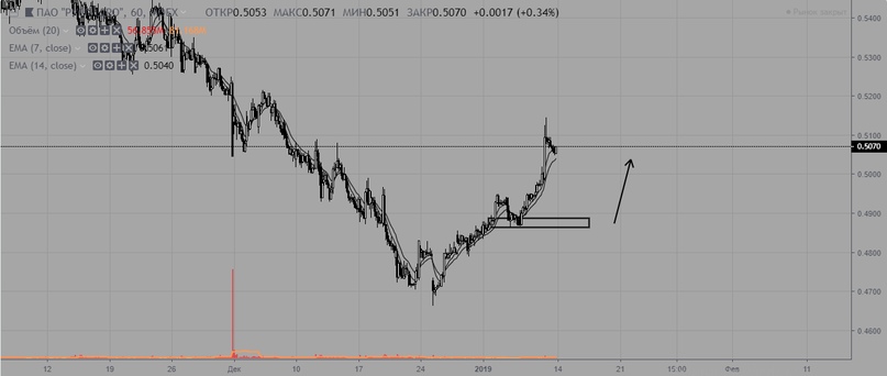 Локально бумага находится в растущем тренде, пока цена выше 0,487 — отдаем предпочтение покупкам.
