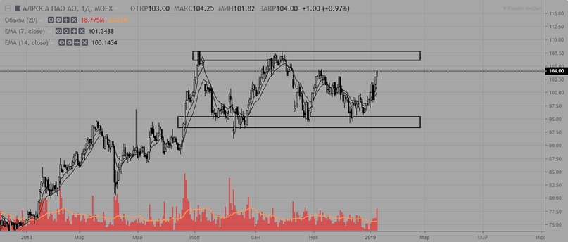 Алроса глобально без изменений, бумага продолжает ходить в боковике. Долгосрочный тренд растущий.