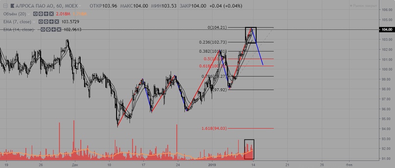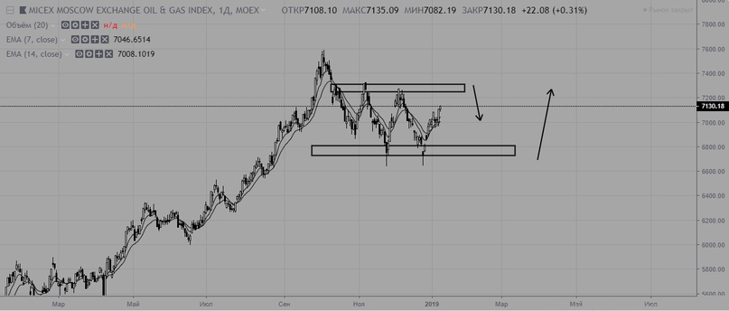 Локально цена стоит на уровне покупателя 60,4. Пока цена не закрепилась ниже уровня — отдаем приоритет покупкам. При пробое уровня стоит ждать коррекцию в район 57, затем 53.