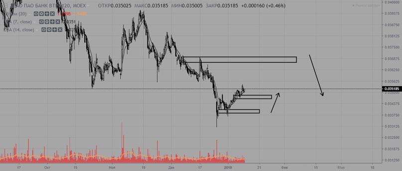ВТБ глобально без изменений, приоритет продаж актуален. Локально цена показала разворот, но движение вверх очень слабое, при таком раскладе покупать не стоит, нужно ждать разворот вниз и отрабатывать продажи. Актуальный уровень интереса покупателя — 0,0347. При его пробое можно возвращаться к продажам.