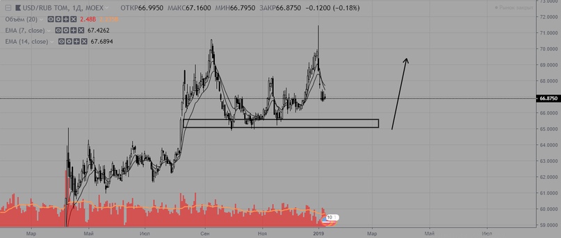 USD/RUB без изменений, зона покупок находится на уровне 65.