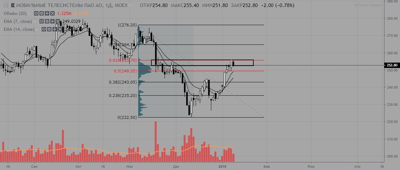 МТС уперся в уровень, от которого с большой вероятностью может начаться сильная волна продаж: фибо 62, максимальный объем волны. Если цена подйет выше, то тренд может продолжится до уровня 280.