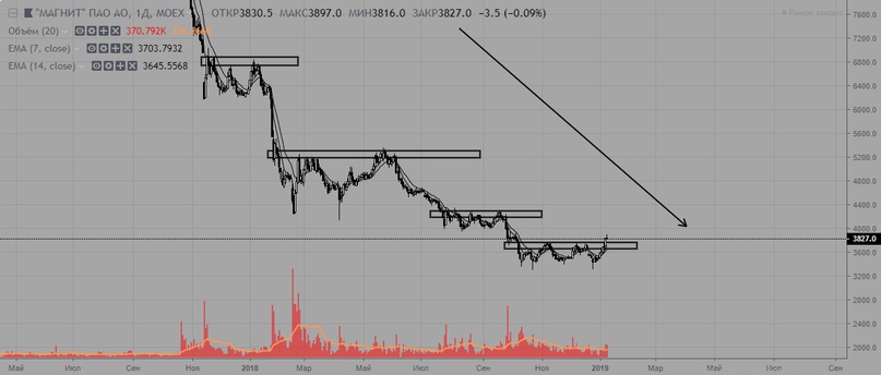 Магнит, после долгого боковика и захода крупного объема по 3500, пробил долгосрочный уровень продаж вверх.