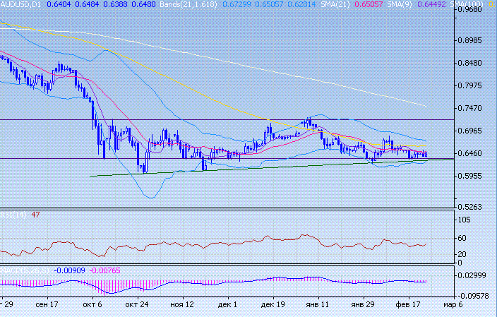 Консолидация в узком диапазоне по поддержке 0,6360/0,6330. Сопротивление оказывают скользящие средние. Торговля ведется в середине полосы Боллинжера.