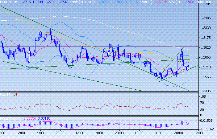 Евро достиг отметок в районе 1,3000, затем резко снизился. Давление на евро не ослабевает. Торговля переместилась в нижнюю половину полосы Боллинжера, что оказывает на евро давление. Сопротивление евро при росте будут оказывать скользящие средние и повышательное сопротивление. Пара торгуется по основанию краткосрочного повышающегося расширяющегося треугольника. В случае, если основание (1,2660) устоит евро подрастет. В противном случае вероятно его снижение к отметкам в районе 1,2525.