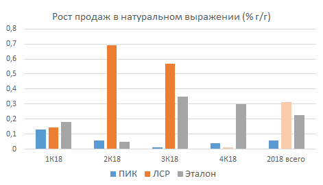 Основные публичные конкуренты — ПИК и Эталон — уже отчитались об операционных результатах. Динамика продаж группы ПИК в 4К18 улучшилась относительно 3К18 и в натуральном, и в денежном выражении. Эталон в 4К18 достиг рекордных темпов роста продаж в денежном выражении (+47% г/г), несмотря на некоторое замедление роста объемов продаж в кв. метрах.