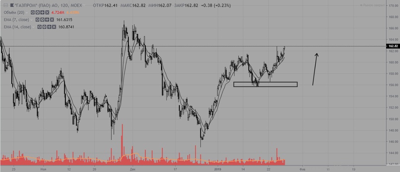 Газпром продолжает волну роста, актуальная поддержка на уровне 156.