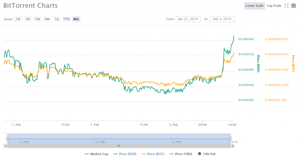 Будет, безусловно, интересно проследить, как сложится дальнейшая судьба этого токена, но уже сейчас сумевшие его приобрести инвесторы в накладе не остались: торги BTT стартовали 1 февраля при курсе в четыре с небольшим раза выше цены токенсейла. А под конец недели после небольшой просадки токен продолжил рост – за последние 24 часа его цена поднялась уже более чем на 35%.