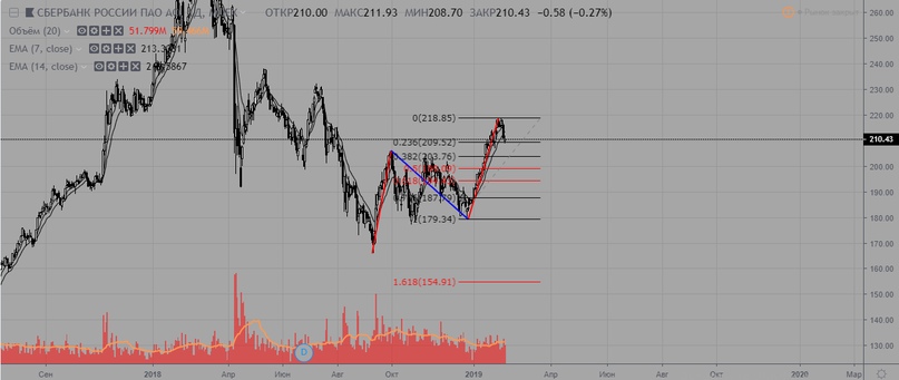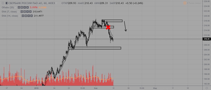 Сбербанк пробил вниз краткосрочную поддержку на 215, которую образовал в течение недели, тем самым развернув тренд вниз. Актуальное сопротивление на уровне 218. Ближайшая поддержка на уровне 206.