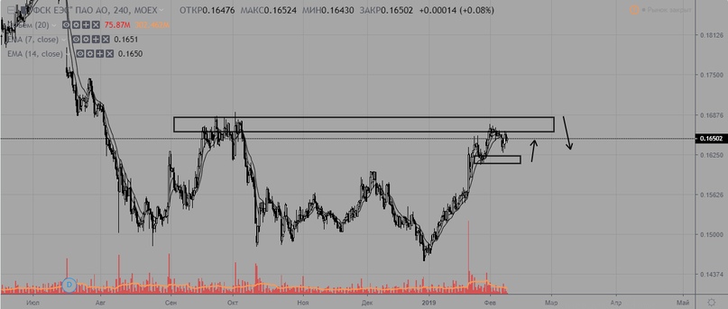 ФСК без изменений, бумага остановилась около уровня сопротивления на 0,168. Актуальная поддержка на уровне 0,161, пока цена выше — отдаем предпочтение покупкам.