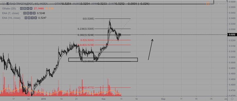 Русгидро пробило уровень сопротивления 0,52 вверх. На данный момент цена совершила достаточно глубокий откат на половину волны роста, кроме того, продавец явно слабее покупателя, так что складывается хорошая картина для продолжения растущего тренда.