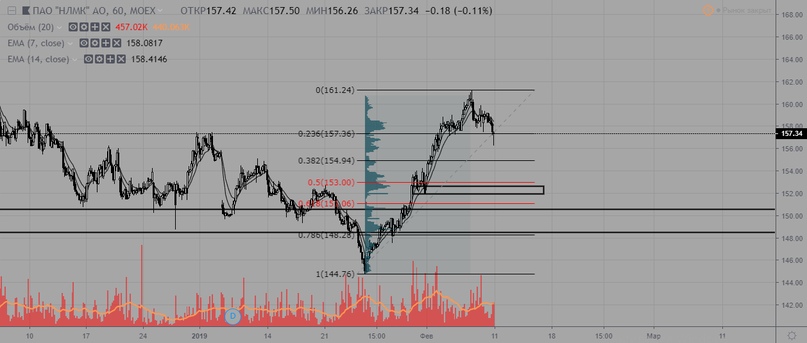 НЛМК совершила сильную волну роста после ложного пробоя поддержки на 150, после чего откатывает вниз.