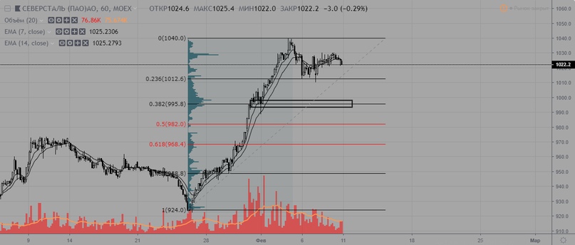 Северсталь совершила очень мощную волну роста. Максимальный объем волны находится на уровне 995-1000 и совпадает с уровнем 38 коррекции по Фибоначчи, что делает этот уровень потенциальным для разворота вверх, если коррекция будет развиваться дальше.