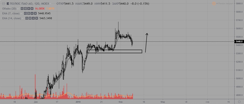 Полюс продолжает растущий тренд. Актуальный уровень поддержки находится на 5320, пока цена выше — отдаем предпочтение покупкам.