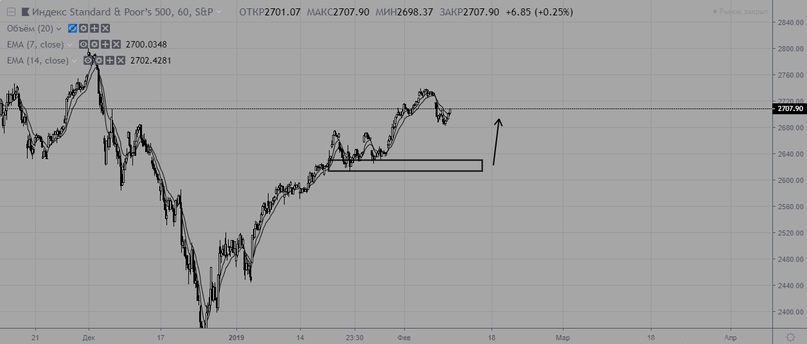 На более длинном промежутке индекс смотрится сильно. От уровня 2300 идут мощные покупки, последняя волна роста обновила максимум. Закономерно после сильной волны роста идет откат, посмотрим насколько глубоким он окажется. 2370-2440 — диапазон, в котором высока вероятность окончания коррекции.