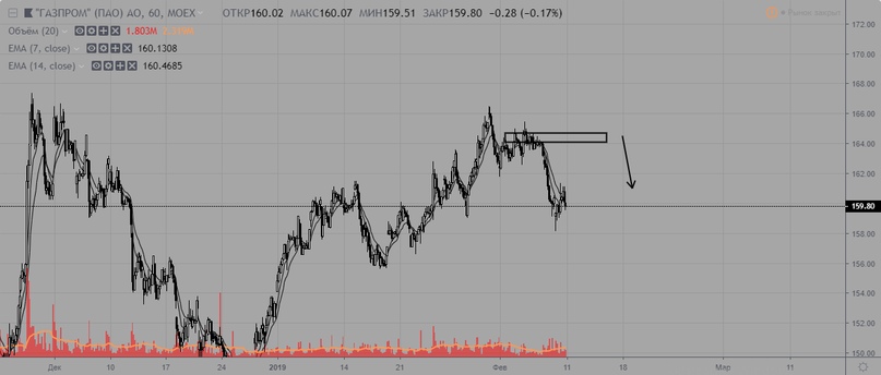 Газпром продолжает коррекцию. Актуальный уровень сопротивления находится на 165, пока цена ниже — отдаем предпочтение продажам. Цена концентрируется на поддержке на уровне 160, покупатель не проявляет особую инициативу, так что высока вероятность продолжения коррекции.