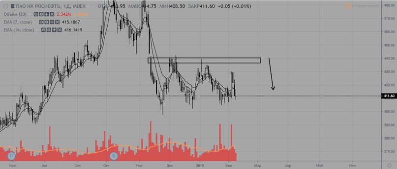 Долгосрочный тренд все еще нисходящий, так что совершать покупки опасно. Зато можно вернуться в шорт от уровня 435-440 или на пробое вниз локальной поддержки на 410.