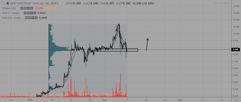 Система вышла из боковика вверх, после чего благополучно откатила назад. Актуальный уровень поддержки находится на 9,5, ниже которого цена не может закрепиться. Очень важно, чтобы цена не закрепилась ниже уровня 9,5, на котором также скопились большие объемы, так как это будет означать окончание растущего тренда.