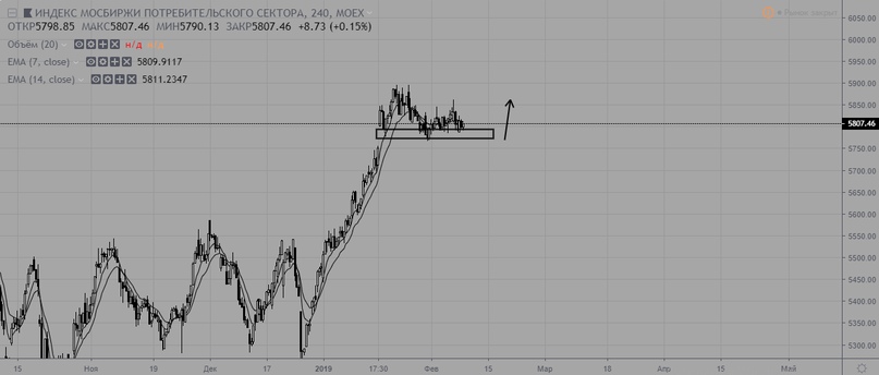 Индекс потребительского сектора без изменений, цена концентрируется на уровне поддержки 5780. В случае пробоя поддержки — будет достаточно глубокий откат к мощной волне роста от 5220.