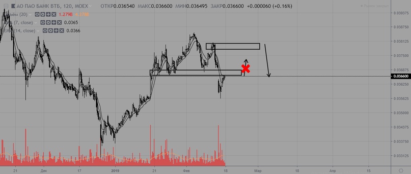 ВТБ пробил уровень поддержки восходящего тренда, что дало сигнал на его смену. Актуальный тренд нисходящий с сопротивлением на уровне 0,038. Пока цена ниже этого уровня — отдаем предпочтение продажам.