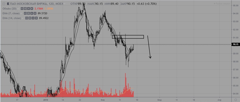 Мосбиржа пробила вниз поддержку на уровне 90, что дало сигнал на разворот тренда вниз. Актуальный тренд нисходящий с сопротивлением на уровне 91,3.