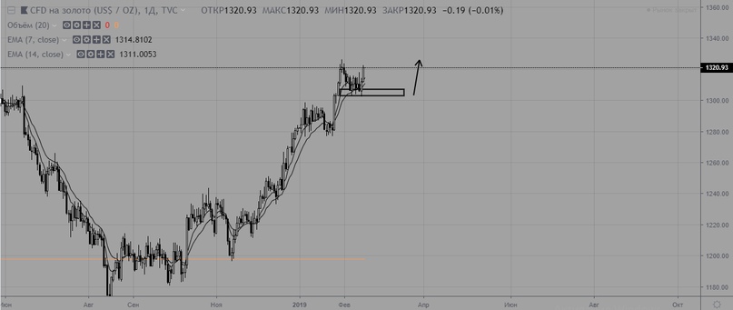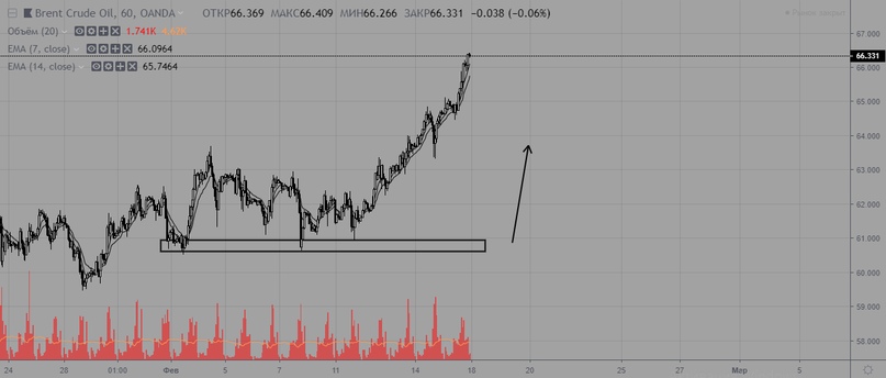 Нефть пробила боковик вверх и начала ралли. Тренд сменился на восходящий с актуальной поддержкой на уровне 59. Учитывая, какой большой объем набился в боковике, можно ждать повторение по силе предыдущего импульса. При таком сценарии цена может расти до 72.