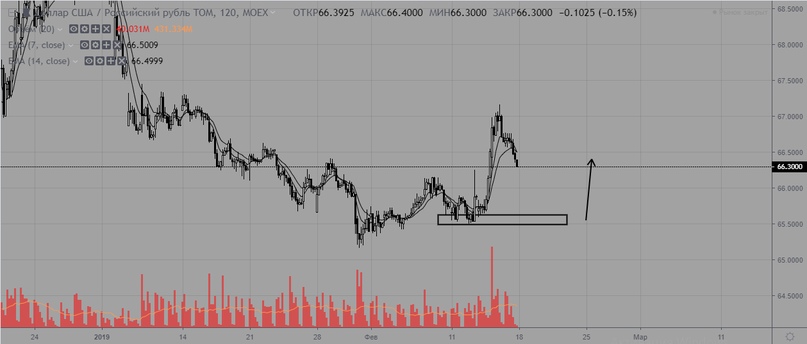 USD/RUB глобально без изменений, локально цена импульсом пробила уровень сопротивления, дав сигнал на смену краткосрочного тренда вверх. Актуальная поддержка находится на уровне 65,5. Пока цена выше — отдаем предпочтение покупкам.