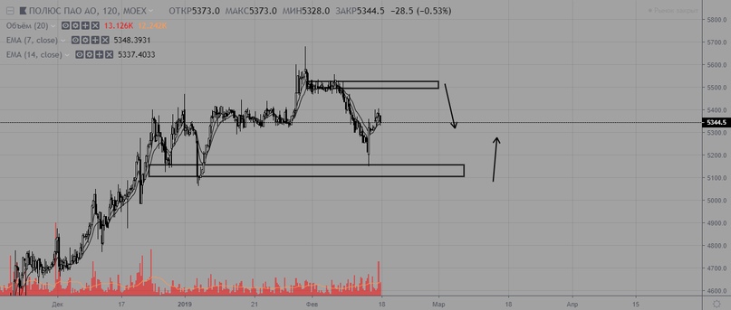 Полюс сменил локальный тренд на нисходящий, актуальное сопротивление на уровне 5530. Среднесрочный тренд все еще восходящий с поддержкой на уровне 5100.