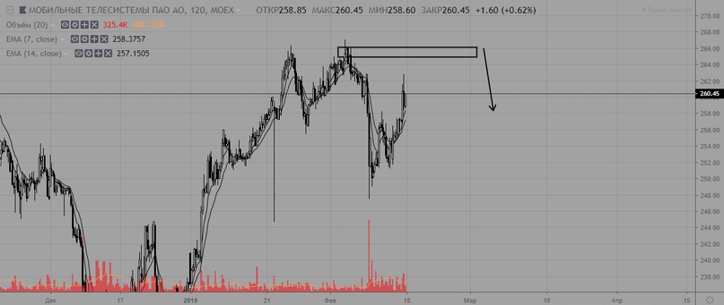 МТС без изменений, актуально сопротивление на уровне 266, пока цена ниже — отдаем предпочтение продажам.