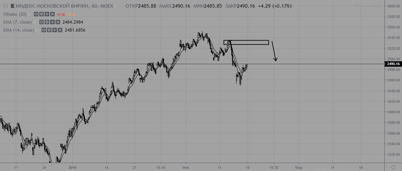 Индекс МосБиржи продолжил коррекцию. Актуальный уровень сопротивления — 2535. Пока цена ниже этого уровня — сохраняется риск возобновления продаж и обновления локальных минимумов.