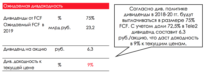 По нашим ожиданиям, FCF Ростелекома в 4кв. 2018 составит около 7,4 млрд. при среднем за 2018 год уровне рентабельности EBITDA 32% и выполнении guidance по CAPEX, равного 65 млрд руб. за 2018 год.