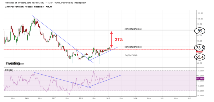 На недельном графике видно, что акции одновременно находятся вблизи восходящей трендовой линии, а также около уровня сопротивления (73.45), в случае преодоления которого открывается уровень 89.00. Если же линия тренда будет сломлены, то уровнем поддержки выступит отметка 65.40