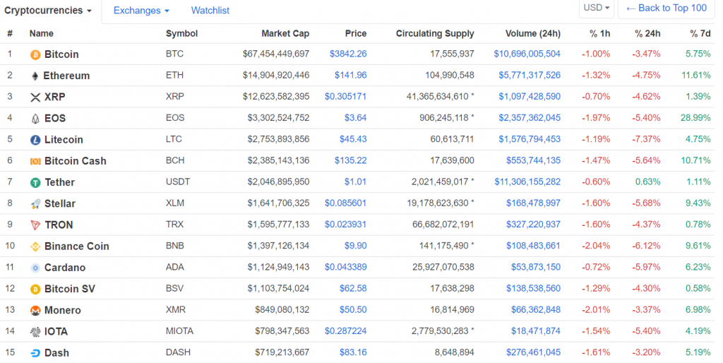 Первая десятка CoinMarketCap за эту неделю изменений не претерпела, однако, если сравнивать с показателями прошлого воскресенья, рынок по-прежнему находится в зеленой зоне. Также нельзя пройти мимо впечатляющего роста EOS, который за этот период поднялся в цене на 30%.