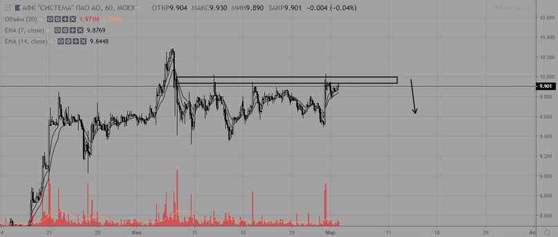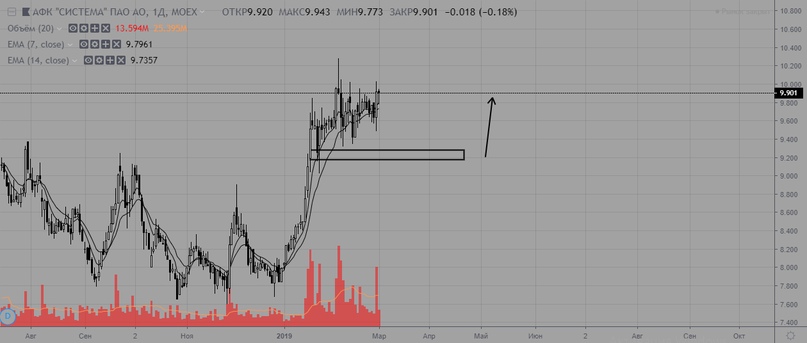 Система в очередной раз пытается пробиться выше уровня сопротивления. При пробое и закреплении выше уровня 10, высока вероятность продолжения среднесрочного восходящего тренда.