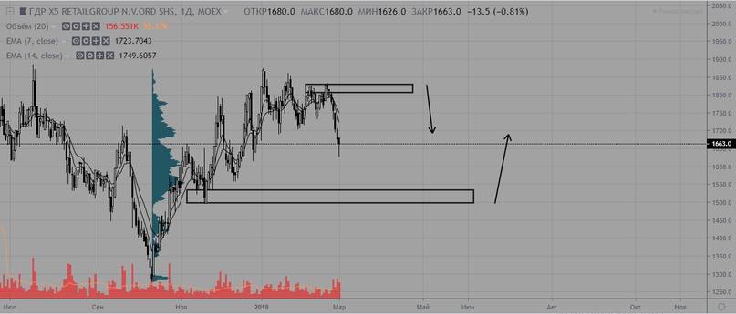 X5 пробило боковик вниз, тем самым сменив тренд на нисходящий. Актуальное сопротивление среднесрочного нисходящего тренда на уровне 1833. Долгосрочный тренд восходящий, поддержка находится на уровне 1500, в этом же районе сконцентрированы максимальные объемы волны роста, что делает этот уровень наиболее благоприятным для покупок.