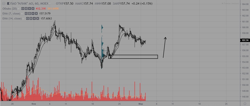 НЛМК вяло корректируется в рамках краткосрочного восходящего тренда. Актуальная поддержка на уровне 154,6-155, на этом же уровне сконцентрированы максимальные объемы волны, так что покупки от этого уровня максимально безопасные.