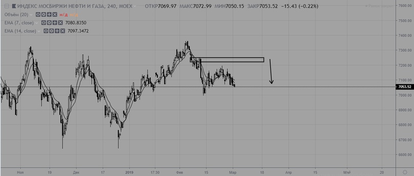 Нефтегазовый сектор без изменений, актуален нисходящий краткосрочный тренд с сопротивлением на уровне 7250. После мощного импульса вниз произошла вялая коррекция, на данный момент идет усиление продаж, так что высока вероятность продолжения нисходящего тренда с обновлением локальных минимумов.
