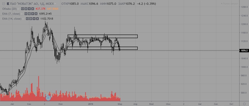 Новатэк продолжает ходить в боковике, однако, агрессия покупателя явно ослабла. Об этом говорит концентрация и закрытие цены на уровне поддержки, что повышает вероятность пробоя боковика вниз.