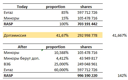 Ниже — чисто гипотетический вариант развития событий. Без сквиза, просто размытие и внесение ВЭБом своих активов за пакет в 25%. Миноры полностью выкупают свою пропорцию в доп эмиссии: