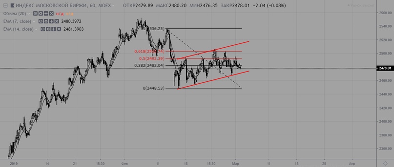 Невооруженным глазом видно, насколько текущая волна роста по динамике слабее предшествующей ей волне падения. В такой ситуации предпочтение стоит отдавать продажам. Для констатации разворота тренда вверх нужна совокупность признаков: мощный импульс вверх с пробоем уровня 2495-2500, слабый по сравнению с этим импульсом откат, закрытие дня выше уровня 2495. Только после этого можно присматриваться к покупкам.