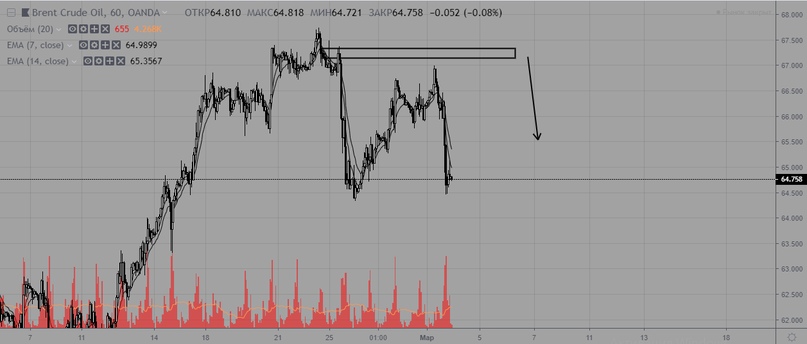 Нефть мощно развернулась вниз, пробив уровень 65,7. После глубокого, но слабого отката, продолжились агрессивные продажи. Актуальный уровень сопротивления краткосрочного тренда — 67,3. Пока цена ниже — отдаем предпочтение продажам.