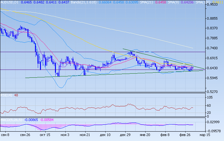 Аусси подрос под понижательное сопротивление (0,6520) затем утратил позиции и снизился. Прорыв сопротивления усилит моментум аусси к росту и позволит ему восстановиться. Поддержка проходит по 0,6360 и далее по 0,6290. Торговля сосредоточена в вершине краткосрочного клина. Давление на поддержки не ослабевает, в случае прорыва доллар вырастет в краткосрочной перспективе к минимумам в районе 0,6000. Нижняя граница полосы Боллинжера не дает доллару расти.