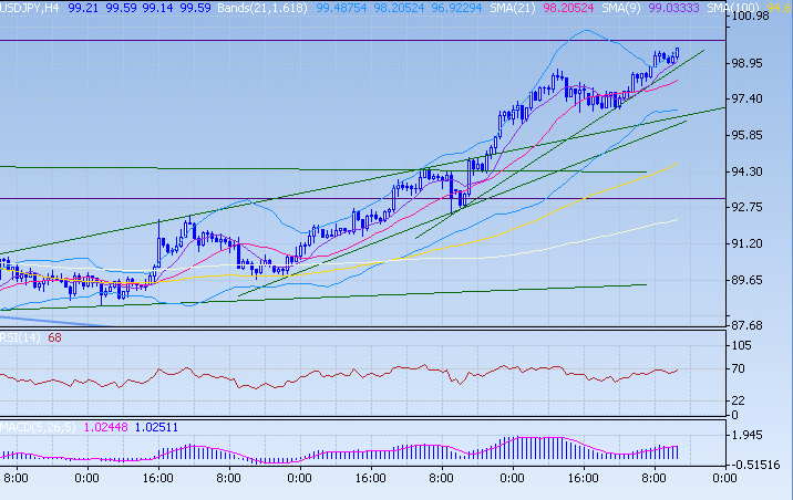 Доллар продолжил завоевывать новые вершины в этой паре. Отметка 100,00 будет достигнута в ближайшее время. Вероятен краткосрочный рост к 100,60, затем видимо последует откат и консолидация. Тем не менее, моментум доллара к росту достаточно сильный, а тренд роста не утратил темпа. Лишь прорыв линии тренда (98,90) вниз обозначит начало периода консолидации или даже коррекции к нижним отметкам. Целевой ориентир 102,60 после модели восходящего треугольника в основании.