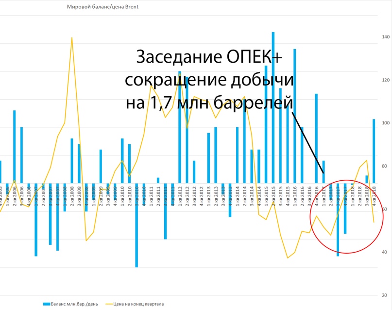 Риск переизбытка сырья вынудил в декабре 2018 года ОПЕК+, принять решение о сокращении добычи на 1,2 млн. баррелей нефти в сутки, на первую половину 2019 года. Принятие решения помогло сбалансировать рынок нефти и привело к росту цены, за баррель, на 23% в течении двух месяцев.