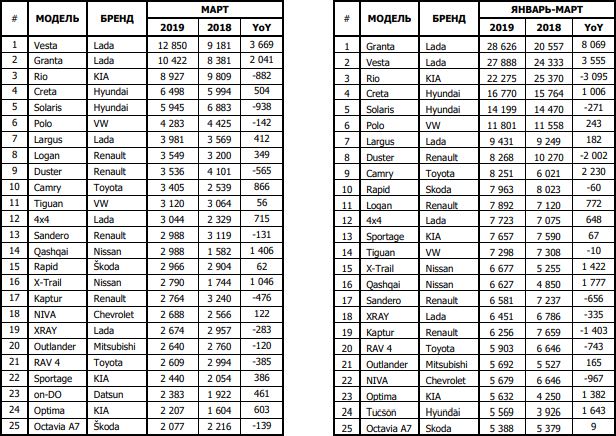 В России продажи новых легковых и легких коммерческих автомобилей в марте 2019 г. выросли на 1.8% (2 901 единиц) к марту 2018 г. и составили 160 180 штук, сообщила Ассоциация европейского бизнеса (АЕБ). Все машины из ТОП-10 продаж местного производства.