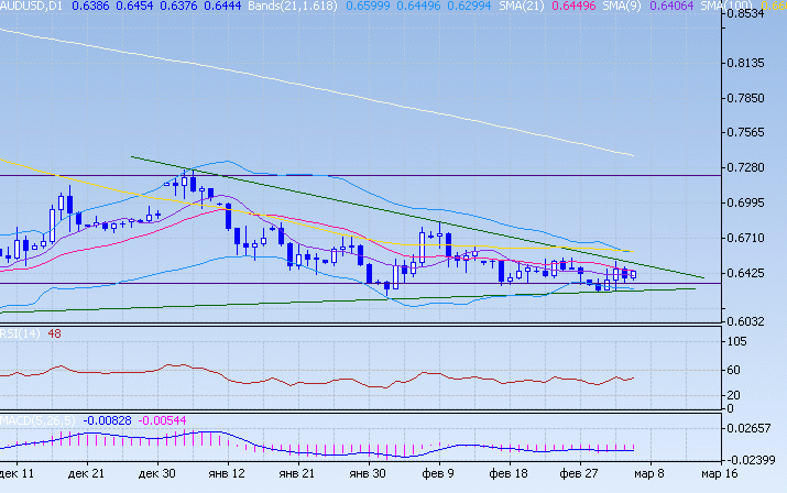 На фоне других валют достижения аусси незначительны. Торговля ведется в вершине предполагаемого клина в районе 9 МА и 21 МА под сопротивлением клина. Поддержки на 0,6360/0,6290 устояли. Прорыв в том или ином направлении обозначит дальнейшее движение пары.