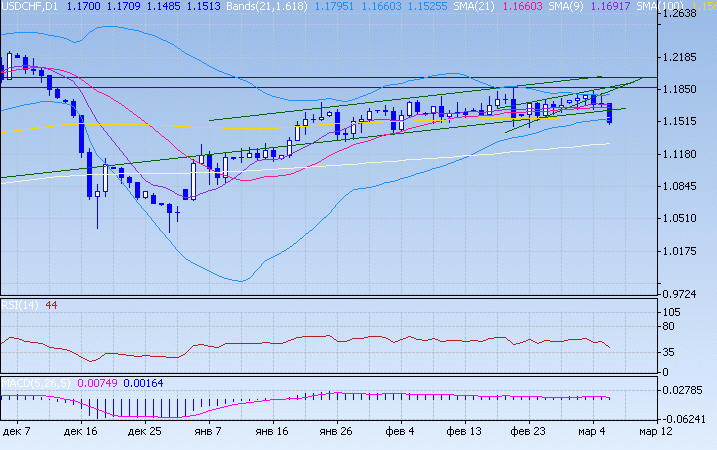 Свисси довольно бодро преодолел серию поддержек и вырос к отметкам в районе 1,1485. Клин полностью отработал свою цель. Доллар отступает против всех континентальных валют и возможно свисси становится одним из активов убежищ на фоне негатива в отношении американской банковской системы. Ожидаем продолжения роста свисси. Цена вышла за пределы нижней границы полосы Боллинжера что будет сдерживать рост свисси. Отметим, что рынок неустойчив и возможны резкие отскоки в этой паре.