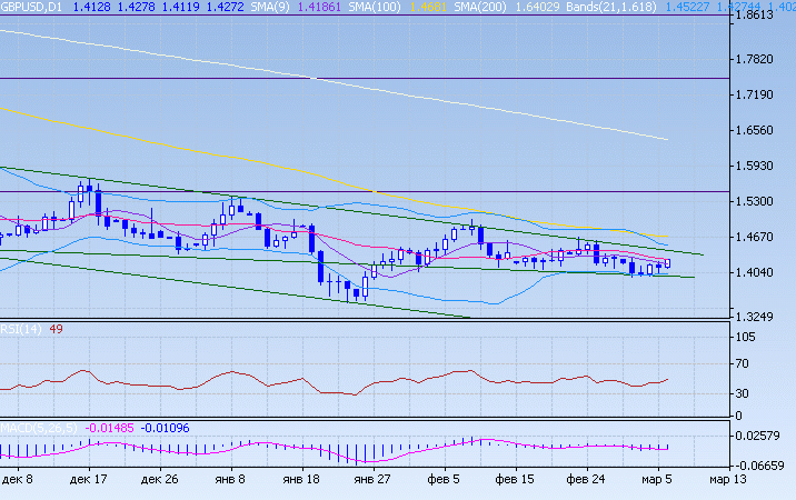 Кризис банковской системы США вносит сильную нервозность и рынки непредсказуемы. В сессию четверга пара торговалась разнонаправлено. В азиатскую сессию стерлинг предпринимает попытки к росту. Торговля ограничена понижательным сопротивлением (1,4420) и понижательной поддержкой (1,3986). Пробой поддержки станет сильным сигналом для снижения стерлинга к минимумам в районе 1,3520. На уровнях в районе 1,3650 находится минимум 2001г. В случае прорыва наверх понижательного сопротивления стерлинг получит импульс к росту, что позволит ему восстановиться. На фоне перекупленности индикаторов прорыв сопротивления маловероятен.