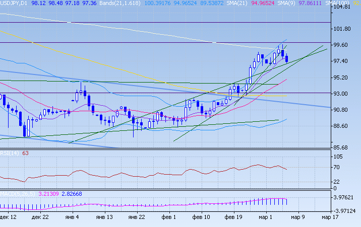 Доллару не удалось вырасти выше отметки 100,00. Йена укреплялась, преодолев быструю линию тренда. Пара нашла поддержку на следующей линии тренда в районе 97,05. Несколько ниже (96,50) проходит повышательная поддержка. Йена вновь выступает валютой хеджа. В случае прорыва поддержек йена подрастет.