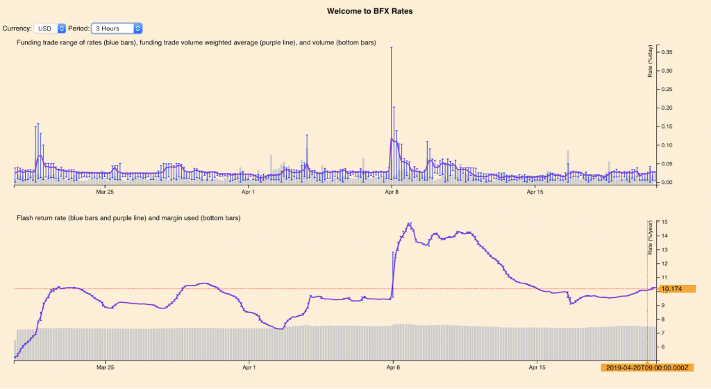 Ниже график процентной ставки кредитования на Bitfinex. Рост спроса на лонги не наблюдается. Но мы вышли из зоны стагнации четвертого квартала 2018 года. Особенно если учесть, что порог для возможности кредитования в $10000 на площадке убран. Это должно привлечь большее количество маржинальных трейдеров, что повлияет на спрос по маржинальному кредитованию.